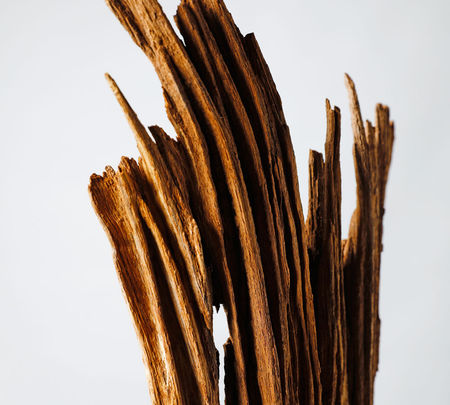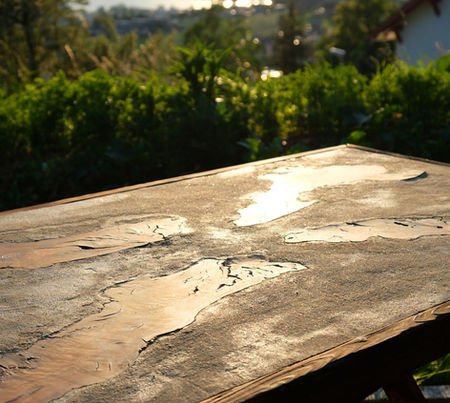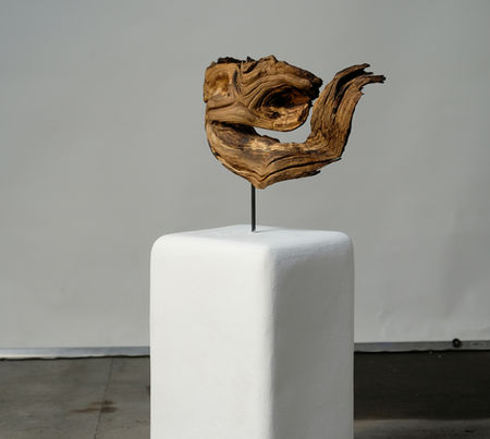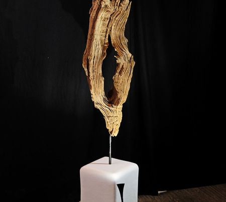 Edles gehobeltes Wurzelholz geölt und gewachst, mit mineralischem Mörtel aus Kalk, Kasein und Maggiasand in Form, umgossen. Unterkonstruk-tion aus Fichtenholz geflammt und geölt.