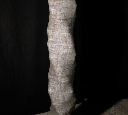 Eingefärbtes Juttegewebe über einem Turban aus der Wüste, darunter ein Metallgerüst und ein wohlgeformter Kastanienfuss aus dem Ticino.