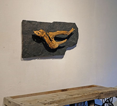 Fein geschwungene Kastanie aus dem Maggiatal abgesetzt auf einer Steinschieferplatte vom Muotatal mit gebräunter Stahlröhrchen und integrierter Aufhängvorrichtung.